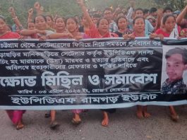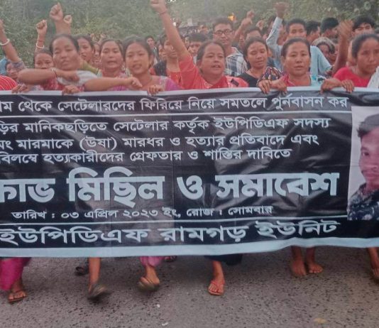 মানিকছড়িতে সেটলার কর্তৃক ইউপিডিএফ সদস্য হ্লাচিং মং মারমাকে হত্যার প্রতিবাদে রামগড়ে বিক্ষোভ