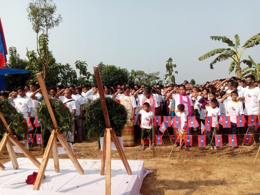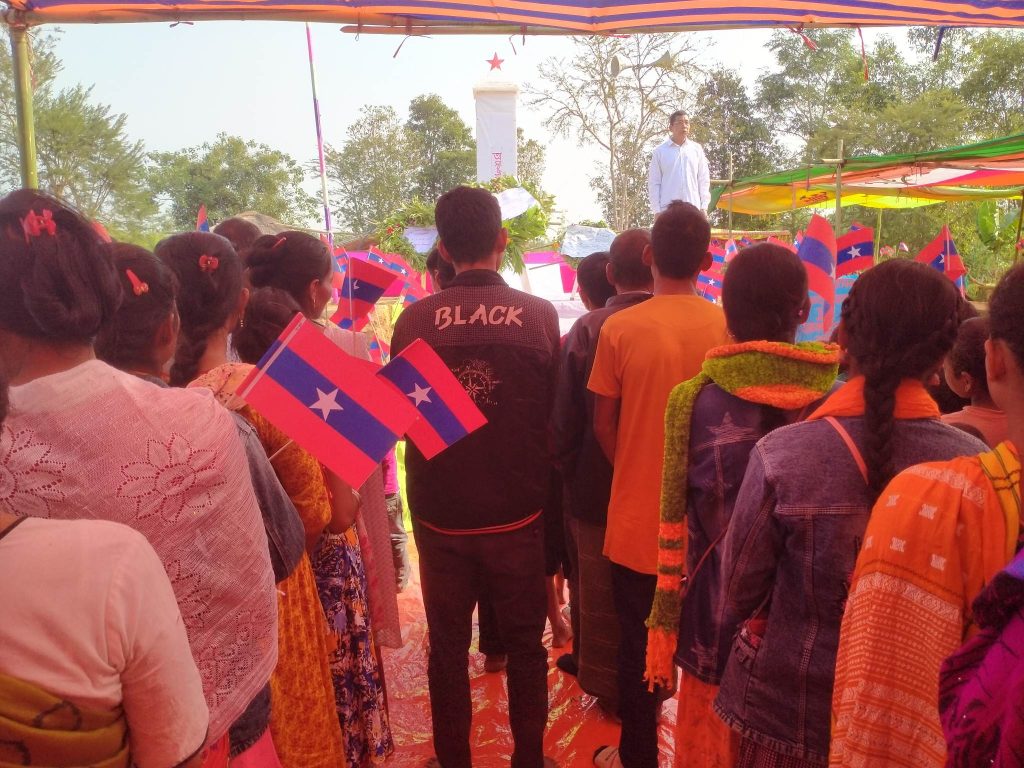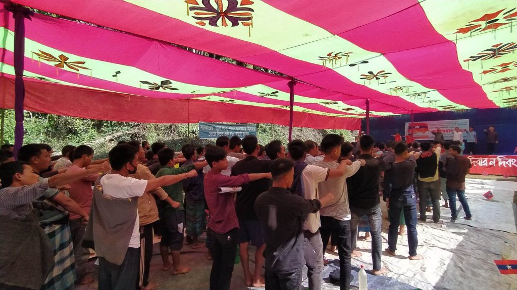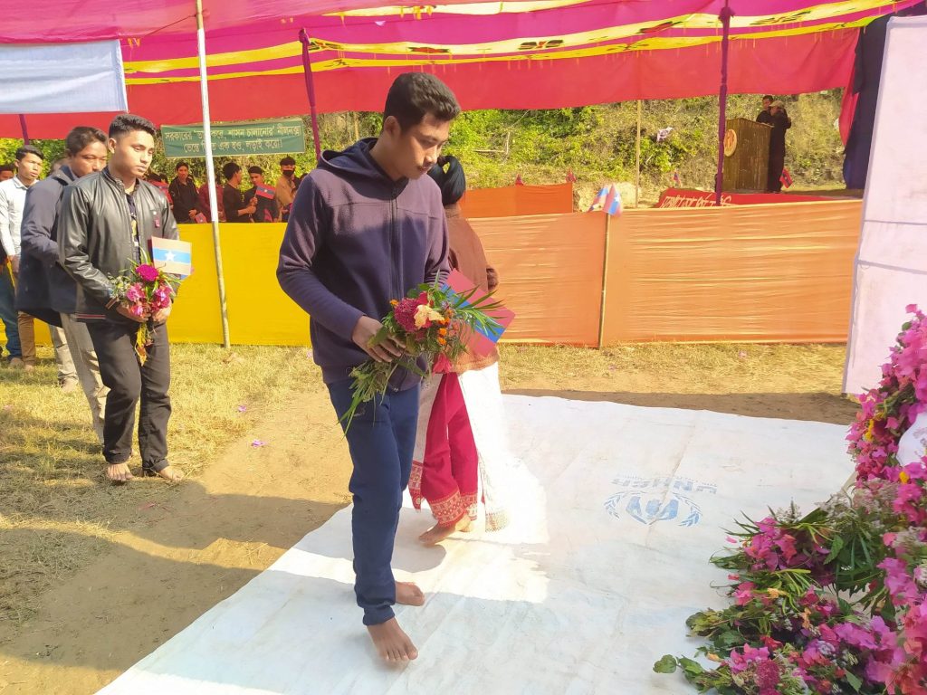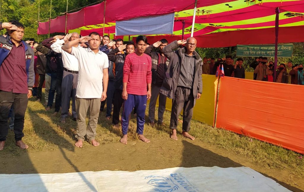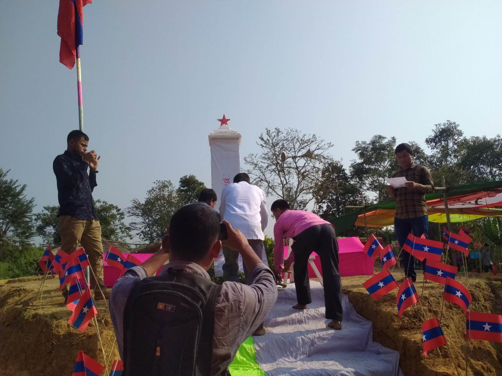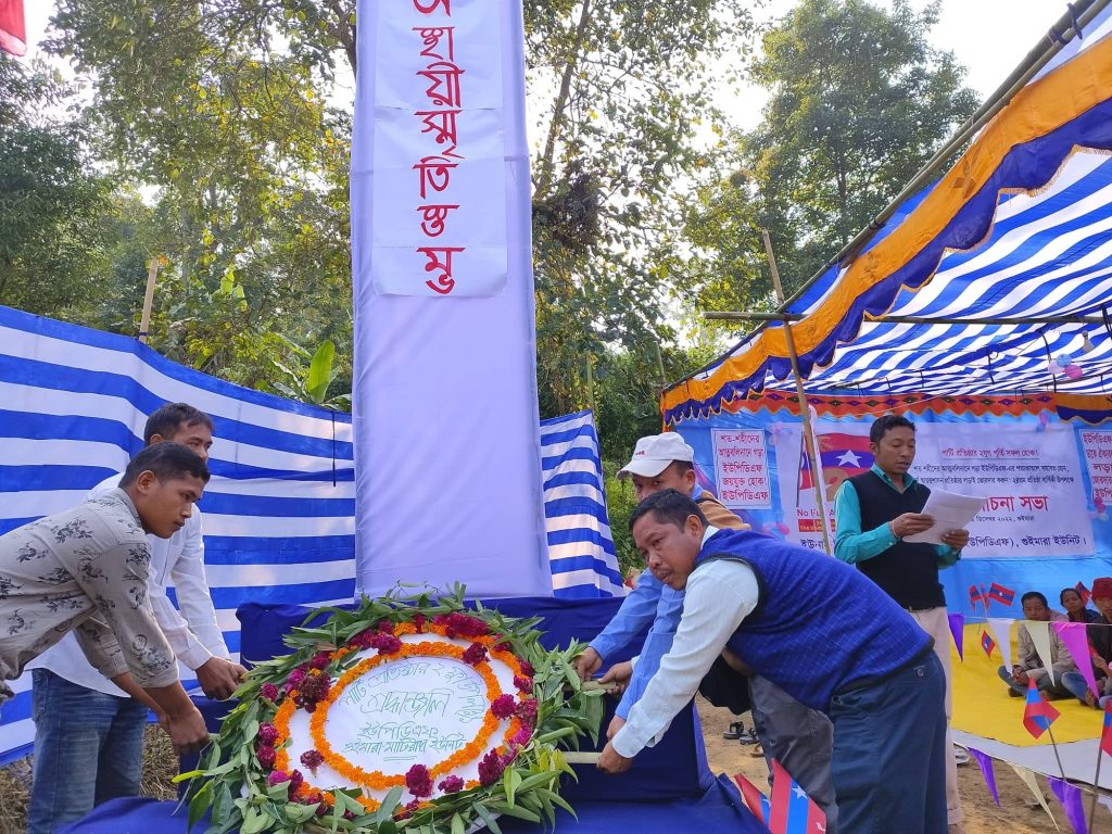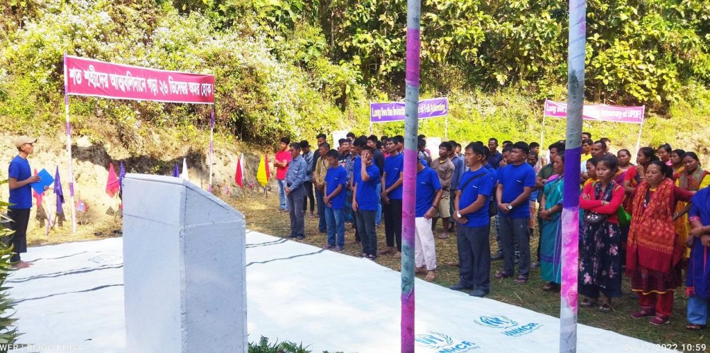 অস্থায়ী স্মৃতিস্তম্ভে শহীদদের প্রতিত শ্রদ্ধা নিবেদনশহীদের প্রতি সম্মান প্রদর্শনইউপিডিএফের পতাকার প্রতি স্যালুট জানাচ্ছেন অংশগ্রহণকারীরা
