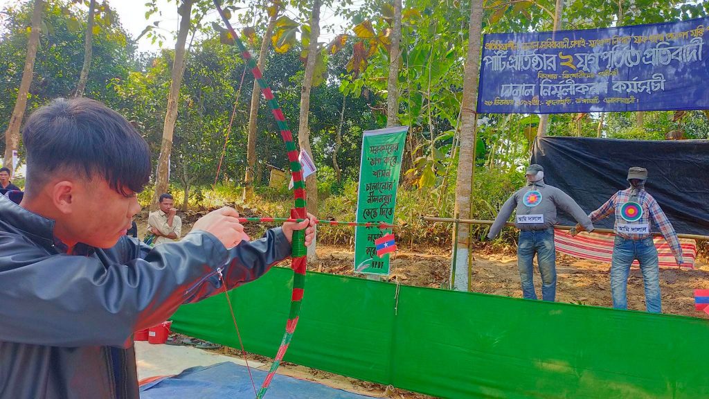 শহীদের প্রতি শ্রদ্ধা নিবেদনআলোচনা সভাদালাল শায়েস্তাকরণ কর্মসূচিতে অংশ নিয়ে এক কিশোর দালালদের তীর নিক্ষেপ করছে