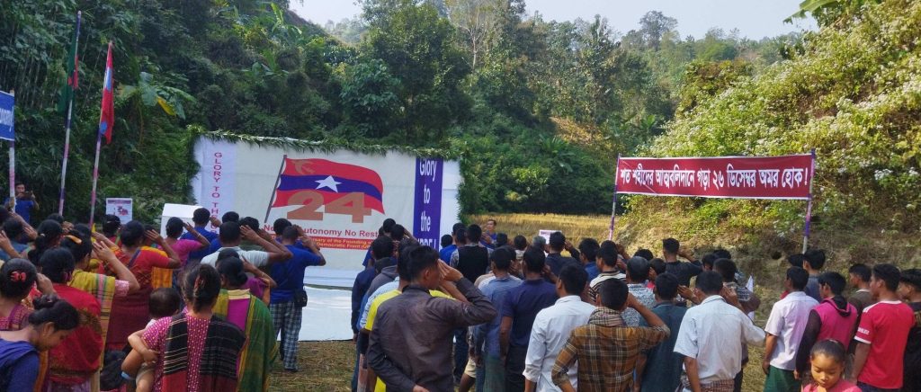 ইউপিডিএফের পতাকার প্রতি স্যলুট জানাচ্ছেন অংশগ্রহণকারীরাদুই যুগপূর্তি অনুূষ্ঠানে সমবেত জনতা