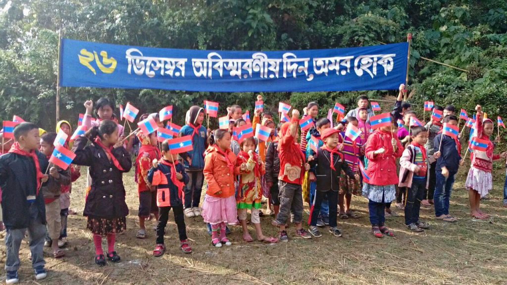 ইউপিডিএফের ২১তম প্রতিষ্ঠাবার্ষিকীতে আয়োজিত অনুষ্ঠানে ইউপিডিএফের পতাকা হাতে শিশু-কিশোররা, ২৬ ডিসেম্বর ২০১৯, খাগড়াছড়ি