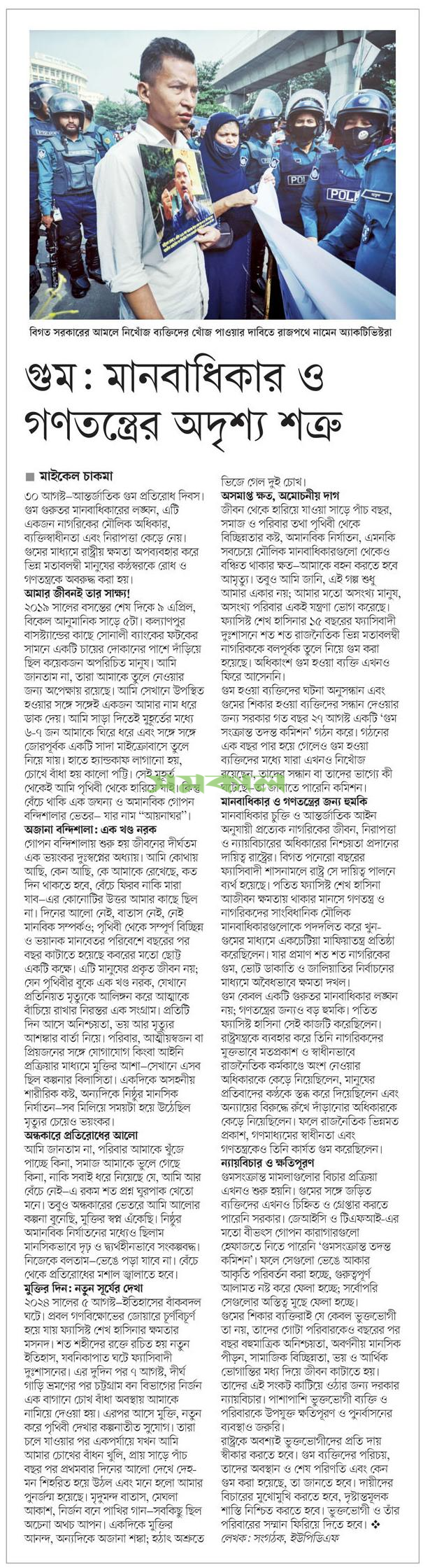 ৩০ আগস্ট–আন্তর্জাতিক গুম প্রতিরোধ দিবস। গুম গুরুতর মানবাধিকারের লঙ্ঘন, এটি একজন নাগরিকের মৌলিক অধিকার, ব্যক্তিস্বাধীনতা এবং নিরাপত্তা কেড়ে নেয়। গুমের মাধ্যমে রাষ্ট্রীয় ক্ষমতা অপব্যবহার করে ভিন্ন মতাবলম্বী মানুষের কণ্ঠস্বরকে রোধ ও গণতন্ত্রকে অবরুদ্ধ করা হয়।