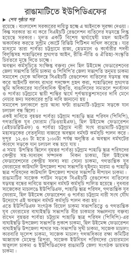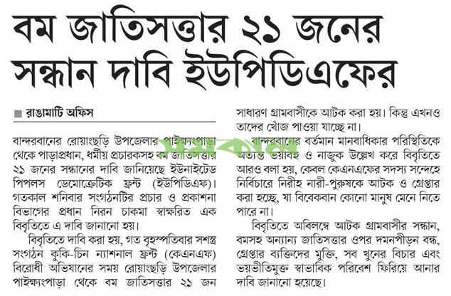 বৃহস্পতিবার ইউনাইটেড পিপলস ডেমোক্রেটিক ফ্রন্টের (ইউপিডিএফ) বিবৃতিতে এসব কথা জানিয়েছেন সংগঠনের সভাপতি প্রসিত খীসা।