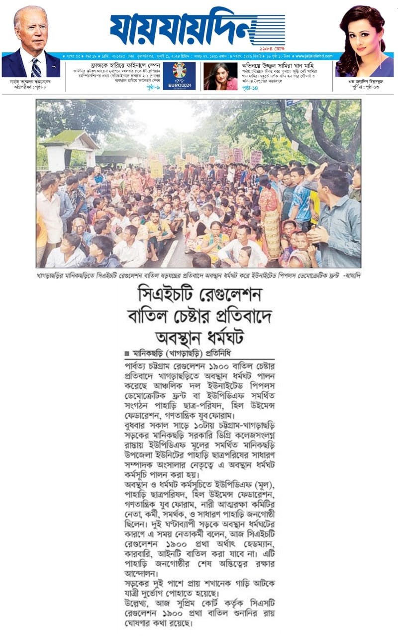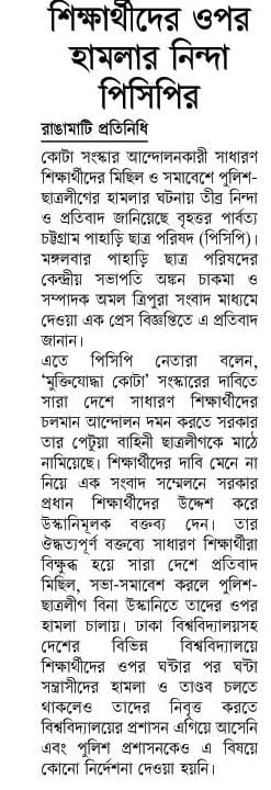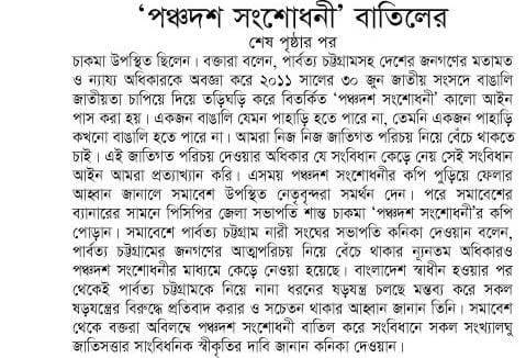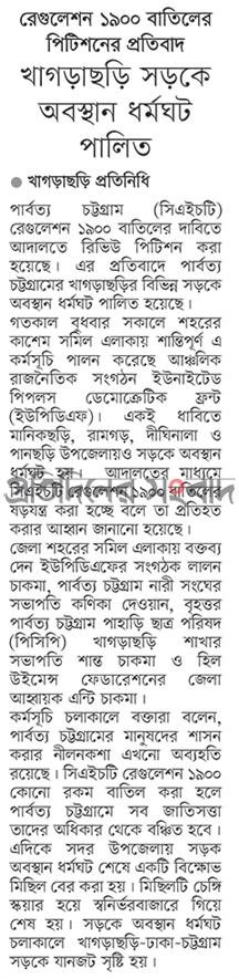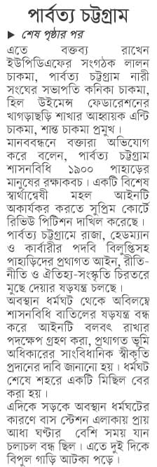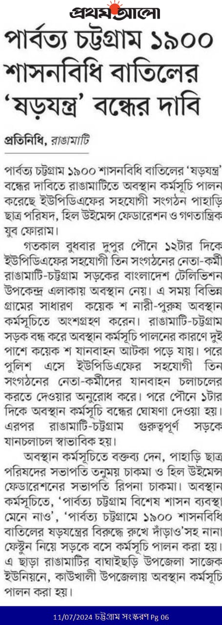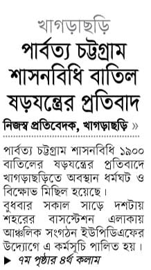 পার্বত্য চট্টগ্রামকে বাদ দিয়ে খণ্ডিতভাবে গণতন্ত্র প্রতিষ্ঠা সম্ভব নয় বলেও ওই বিবৃতিতে উল্লেখ করা হয়।
