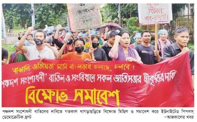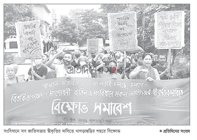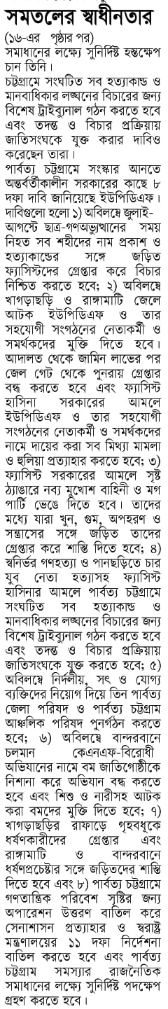 ৩। পার্বত্য চট্টগ্রামে পূর্ববর্তী ফ্যাসিস্ট সরকারগুলোর চালু করা পাহাড়ি বিদ্বেষী রাষ্ট্রীয় নীতি বাতিল করা।