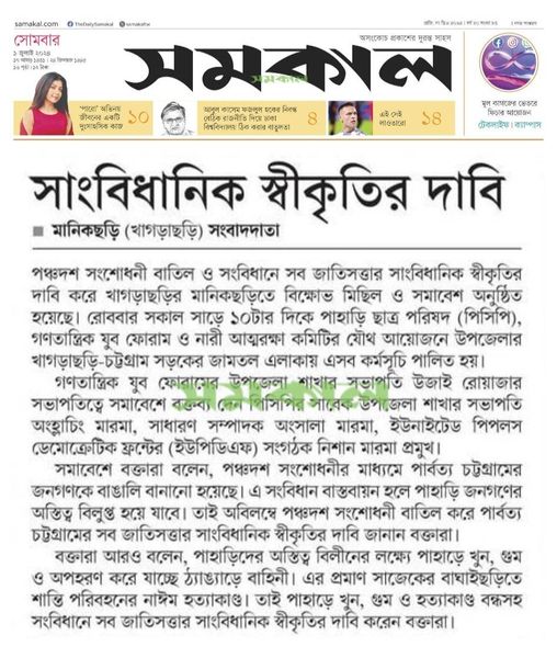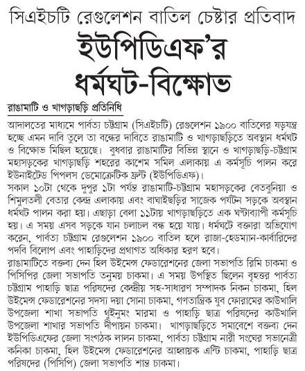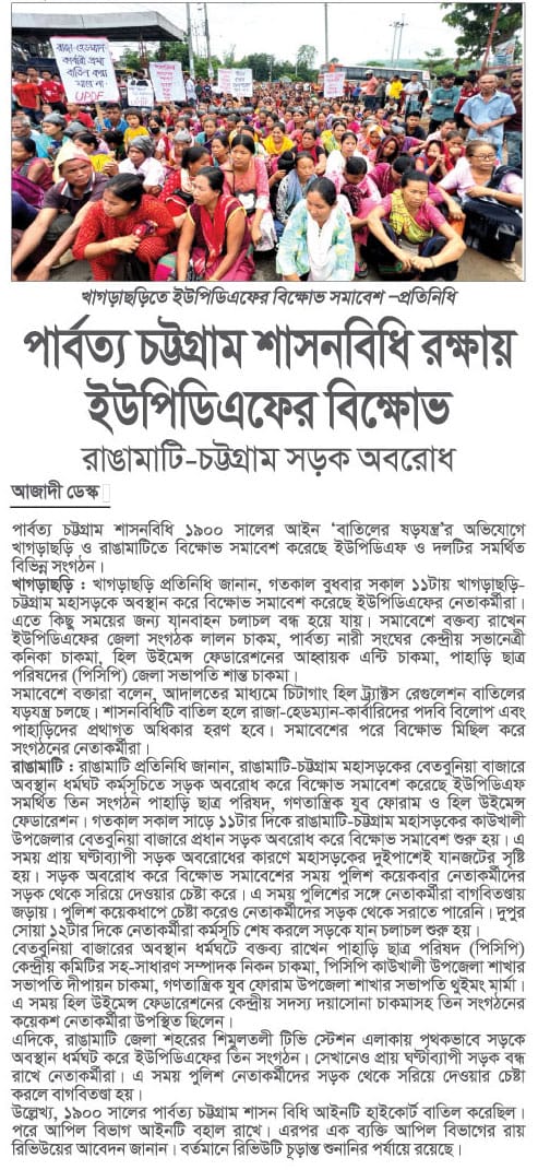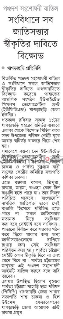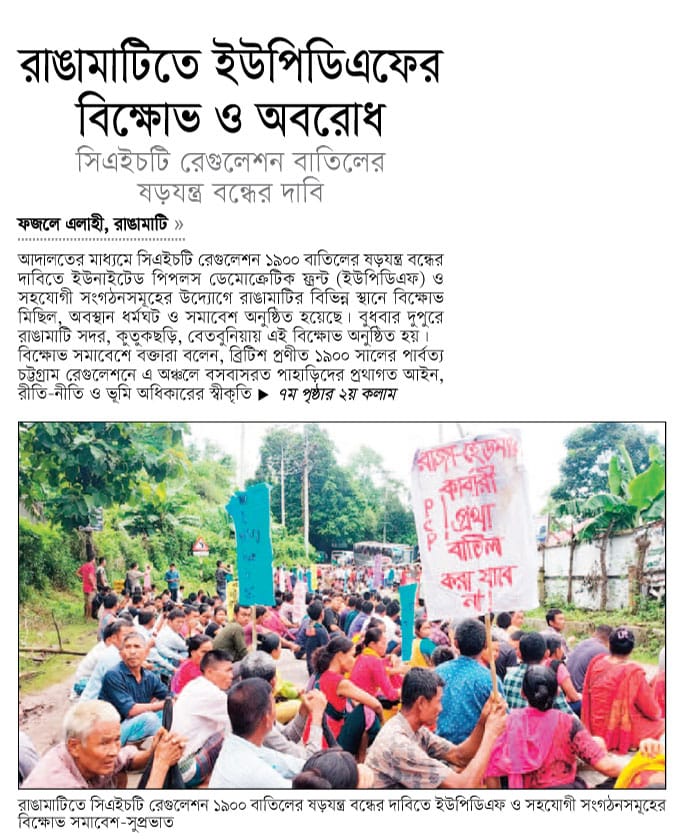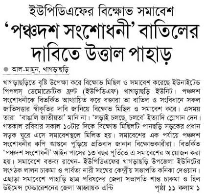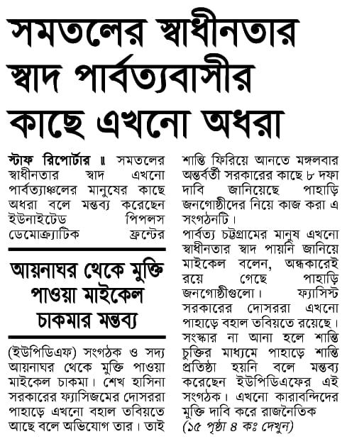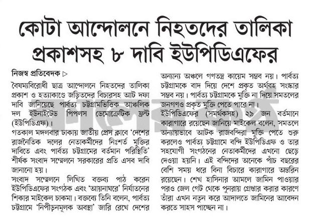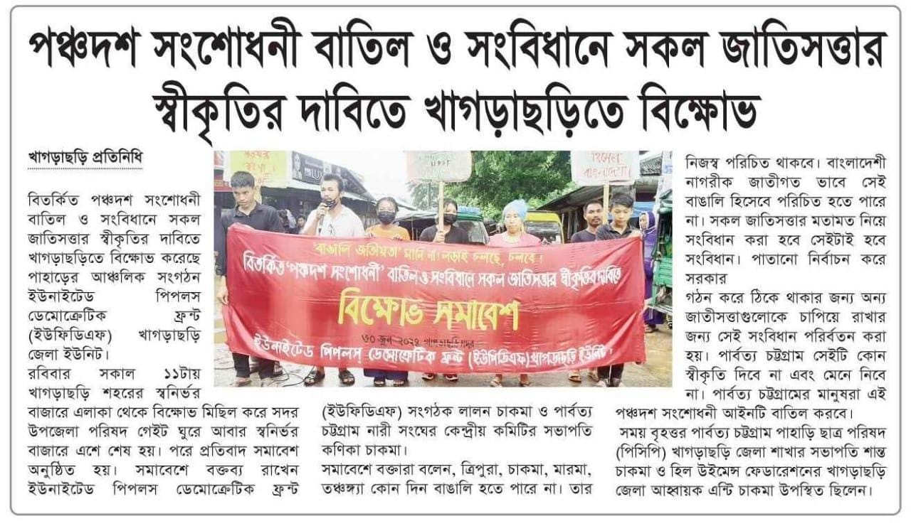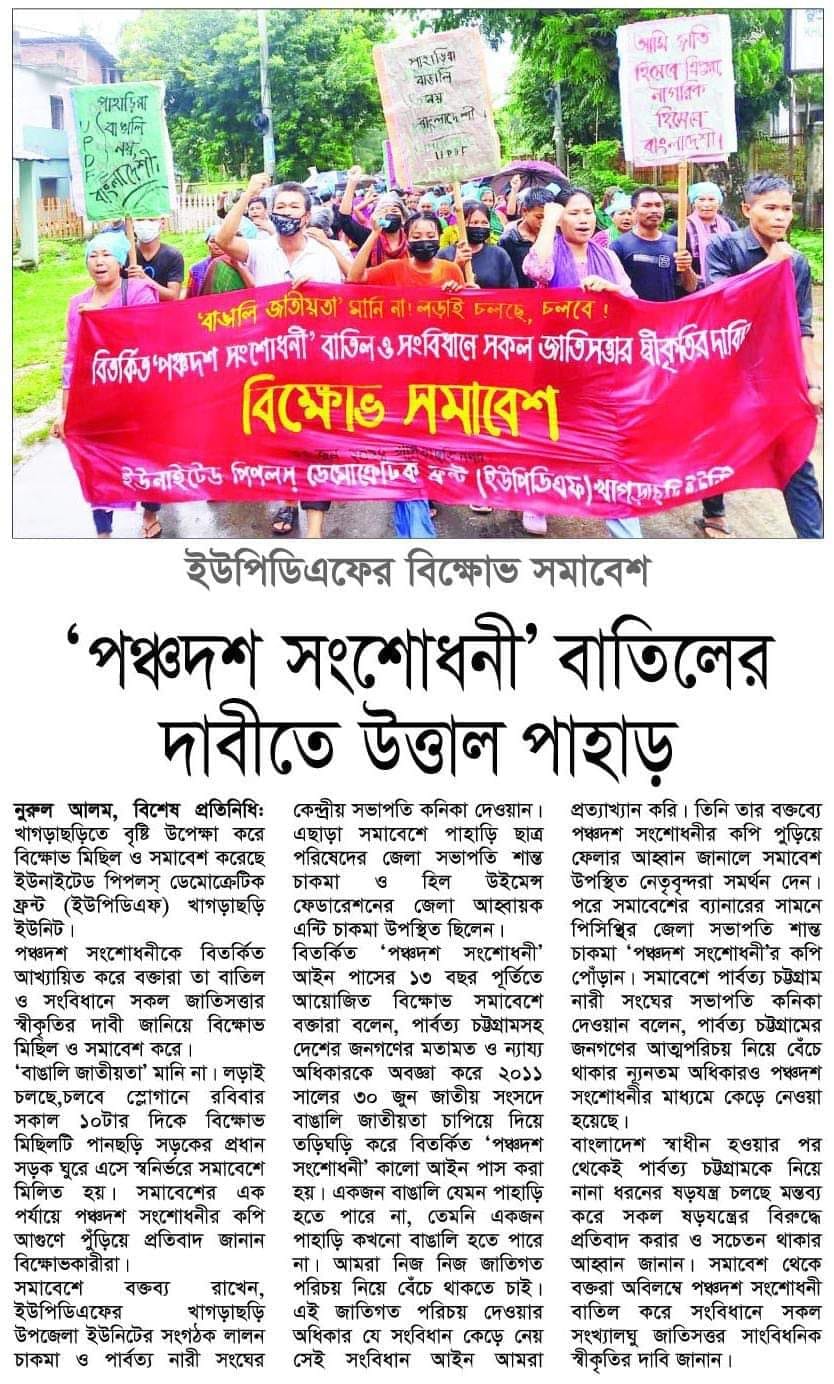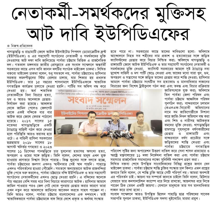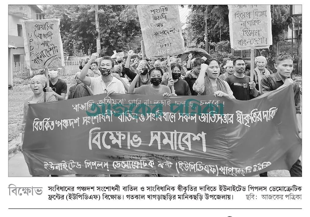 পার্বত্য চট্টগ্রামকে বাদ দিয়ে গণতন্ত্র প্রতিষ্ঠা সম্ভব নয়: ইউপিডিএফ