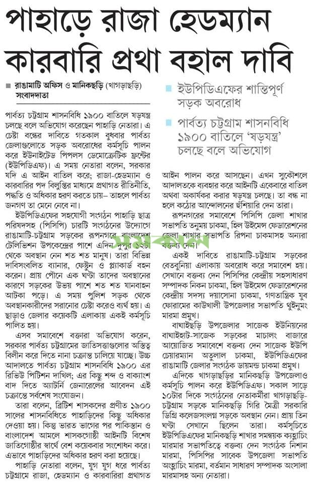 রাঙামাটির লংগদুতে দয়াল চন্দ্র চাকমার রেকর্ডীয় জমি বেদখলের প্রতিবাদে এবং উক্ত জমি বেদখলমুক্ত করার দাবিতে আগামী ১০ ডিসেম্বর সড়ক ও নৌপথ অবরোধ এবং ১১ ডিসেম্বর ভেইবোনছড়া বাজার বয়কটের ডাক দিয়েছে ইউপিডিএফ।