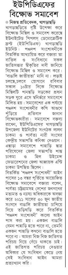 ইউনাইটেড পিপল্স ডেমোক্রেটিক ফ্রন্ট (ইউপিডিএফ) দাবি করে বলেছে, সভা-সমাবেশের ওপর জারি করা সংবিধান পরিপন্থি নিষেধাজ্ঞা প্রত্যাহার করতে হবে। শনিবার সংগঠনটির সহ-সভাপতি নতুন কুমার চাকমার এক বিবৃতিতে বিষয়টি নিশ্চিত করা হয়।