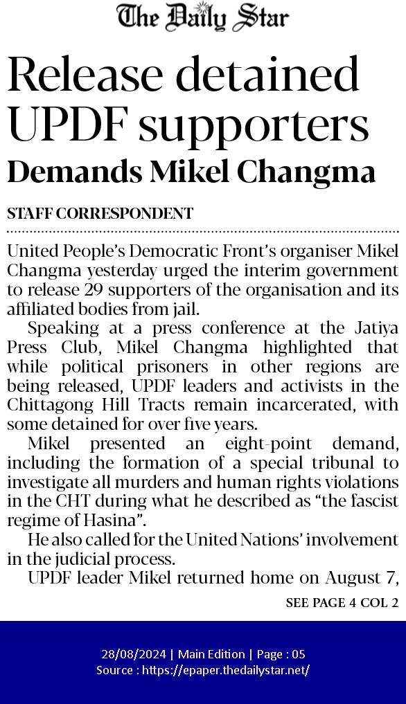 নূতন কুমার চাকমা বলেন, ‘ইউপিডিএফের নেতৃত্বে পাহাড়ি জনগণ পার্বত্য চট্টগ্রামসহ সারা দেশে প্রকৃত গণতান্ত্রিক শাসনব্যবস্থা প্রতিষ্ঠার লক্ষ্যে সমতলের জনগণের সাথে কাঁধে কাঁধ মিলিয়ে ফ্যাসিস্ট হাসিনার জালিম শাসনের বিরুদ্ধে গণঅভ্যুত্থানে অংশগ্রহণ করেছিল এবং ৮ আগস্ট ড. ইউনূসের নেতৃত্বে গঠিত অন্তর্বর্তীকালীন সরকারকে স্বাগত জানিয়ে তাদের যৌক্তিক পদক্ষেপের প্রতি সমর্থন ও সহায়তাদানের কথাও ব্যক্ত করেছিল।