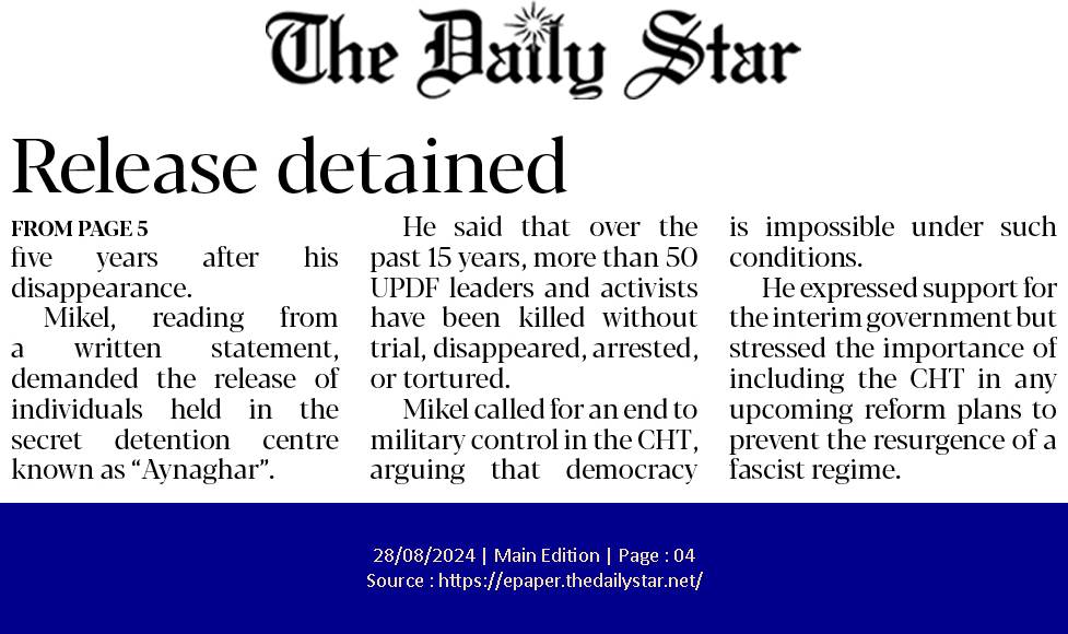 আজ ৬ আগস্ট ২০২৫ বুধবার এক বিবৃতিতে উপরোক্ত মন্তব্য করেন ইউনাইটেড পিপলস ডেমোক্রেটিক ফ্রন্টের (ইউপিডিএফ) সহসভাপতি নূতন কুমার চাকমা।
