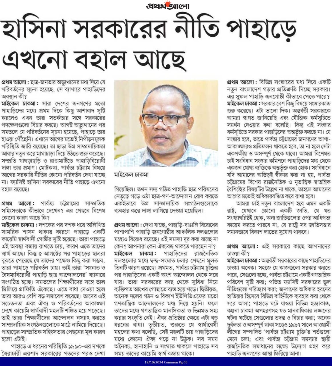 অন্তর্বর্তী সরকারের সঙ্গে শেখ হাসিনা ও আগের সরকারের কোনো পার্থক্য নেই: মাইকেল চাকমা