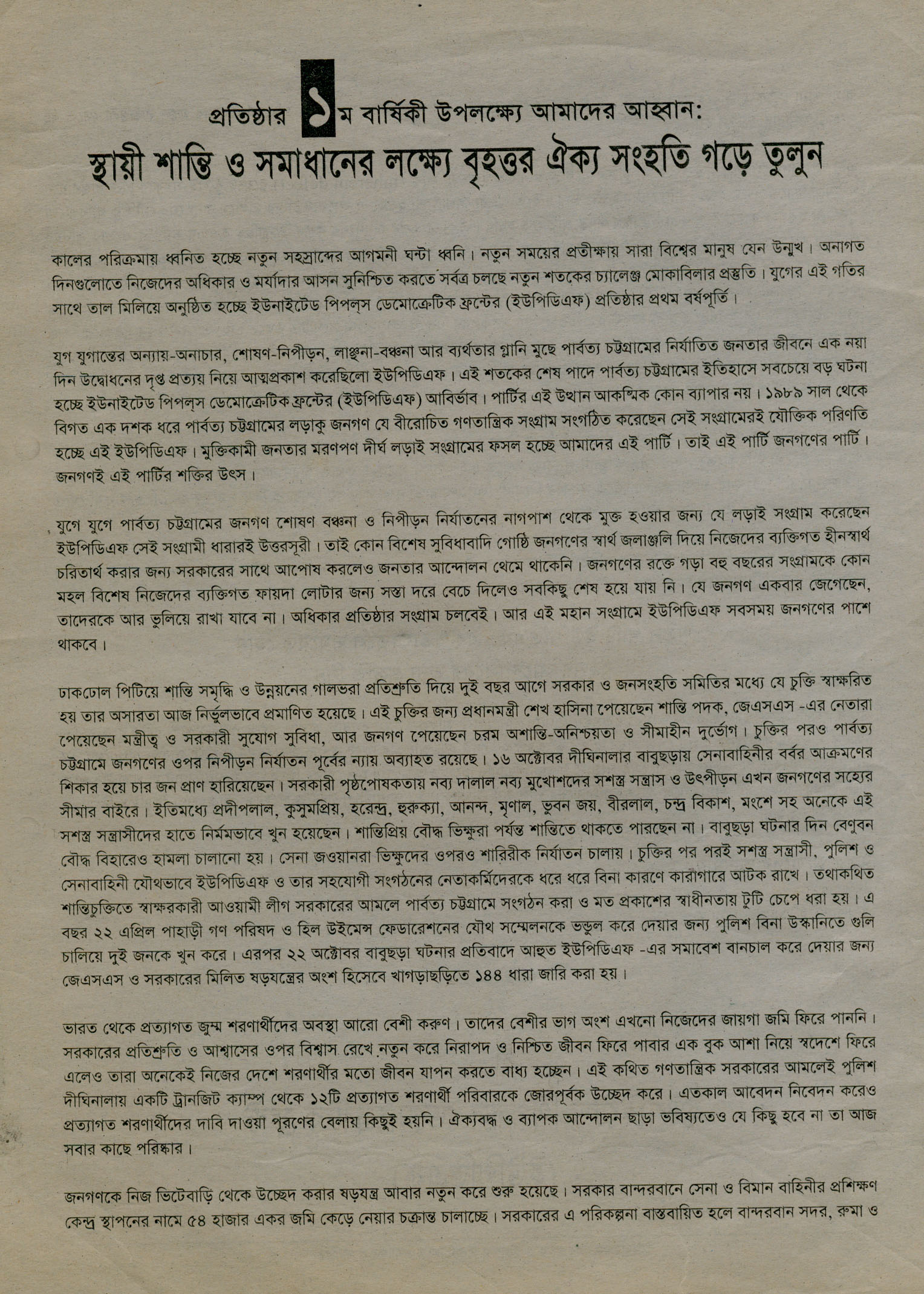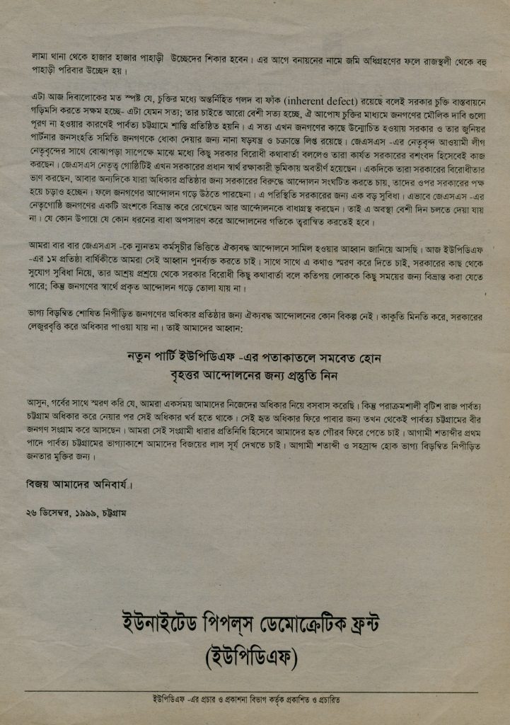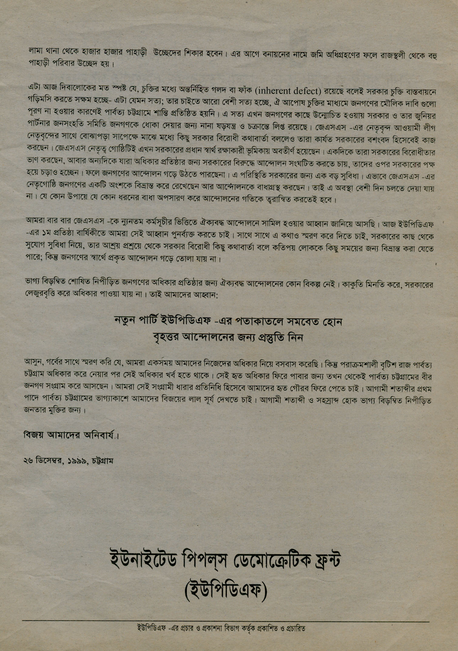 The United Peoples Democratic Front (UPDF) is a political party based in the Chittagong Hill Tracts, Bangladesh. Founded on 26 December 1998 at the end of a Preparatory Conference held in Dhaka, the UPDF is a manifestation of the strong and serious reservations against the Chittagong Hill Tracts Accord of 2 December 1997. The Accord failed to address fundamental demands of the Jumma people. UPDF was formed with a pledge to fight for the right of self-determination of the indigenous Jumma peoples through the establishment of FULL AUTONOMY. The UPDF firmly believes in the principles of democracy, fraternity and equality, and above all it seeks to establish a society free from all forms of oppression and exploitation. The principles of equality of nations, equality of both sexes and non-communal and democratic ideals constitute the basis of all activities of the Party.